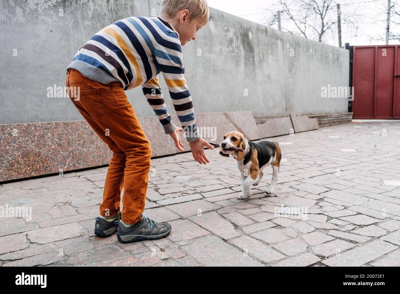 Outdoor Activities For Beagles Games To Play With Beagle Puppies How To Entertain Puppy And Adult Beagle Cute Little Beagle Puppy And Kid Boy Stock Photo Alamy